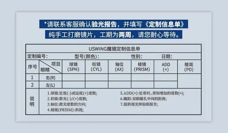 市面上有许多度数太阳镜都难以支持高度数的定制,但Uswing魔镜提供1000度以内近视、远视、散光、渐进多焦点的定制服务,只需要提供近六个月的验光报告即可。而且大部分款式都支持定制,满足不同脸型及喜好需求。