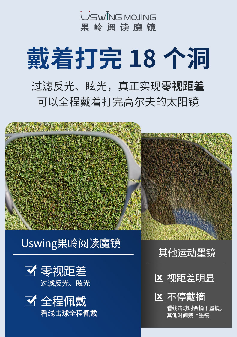 Uswing魔镜作为全球首创专业高尔夫太阳眼镜,提供专业度数定制服务。针对近视、远视、散光的球员量身定制符合需求的镜片,为视力不佳的球友提供一体化解决方案。