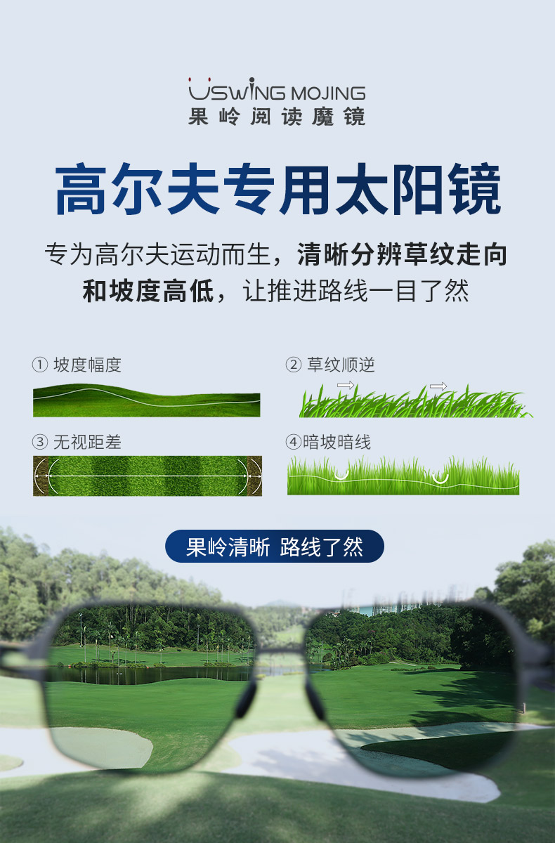 佩戴Uswing魔镜,不仅保护了球员的眼睛不受烈日的伤害,还能帮助球员看清果岭上的一切信息,更加准确地判读线路,大大提升击球进洞率,降低杆数。