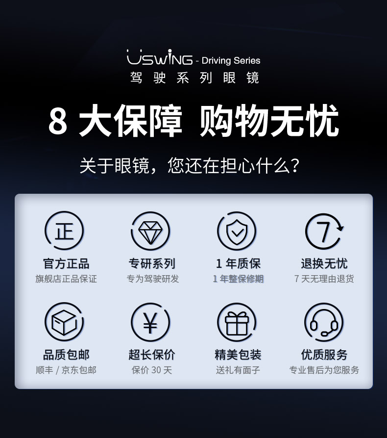 Uswing驾驶系列眼镜采用进口PC镜片,原材多层镀膜,防碎防爆,多方位保护眼睛;日间驾驶,阻隔紫外线,提升色彩饱和度,视野物体轮廓清晰;夜间驾驶,可有效解决杂乱光干扰视线、视物模糊、双眼干涩刺痛、远光灯瞬间致盲等问题,让瞳孔保持在稳定的状态,不会频繁收缩,夜间行车时也能保证眼睛舒适度,享受开车的乐趣。 整副眼镜约20g,带来羽量级超轻盈佩戴体验,适合长时间佩戴。