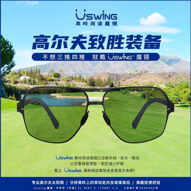 Uswing魔镜作为全球首款专业高尔夫太阳镜,以多层镀膜技术与纳米级工艺为核心,将高尔夫需求转成参数植入镜片。独创的科技专利技术以其强大的滤光功能,真实还原赛场色彩,实现无视距差,清晰分辨草纹走向和坡度高低。