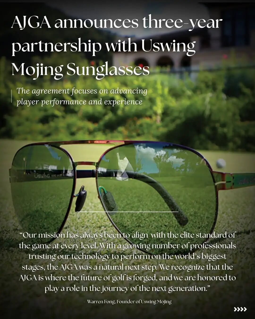 Uswing魔镜创始人方诚毅表示:“我们的使命始终是让Uswing魔镜匹配高尔夫运动各层级的精英标准。如今越来越多美巡赛冠军球手信赖我们的科技并在全球最高舞台使用,而AJGA是高尔夫未来之星的摇篮,与AJGA合作是顺理成章的下一步。我们深知,青少年时期的装备体验的对球员成长至关重要,能够为下一代球手提供助力其脱颖而出的视觉装备,参与他们的成长之路,我们倍感荣幸。”